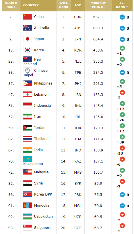 중국 - 오스트레일리아 - 일본 - 대한민국 - 뉴질랜드 - 대만 - 필리핀 - 레바논 - 인도네시아 - 이란 - 요르단 - 태국 - 인도 - 카자흐스탄 - 말레이시아 - 시리아 - 북한 - 몽골 - 우즈베키스탄 - 싱가포르
