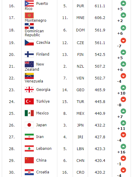 16위~30위: 푸에르토리코 - 몬테네그로 - 도미니카공화국 - 체코 - 핀란드 - 뉴질랜드 - 베네수엘라 - 조지아 - 튀르키예 - 멕시코 - 일본 - 이란 - 레바논 - 중국 - 크로아티아