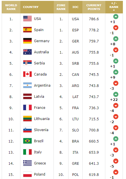1위~15위: 미국 - 스페인 - 독일 - 오스트레일리아 - 세르비아 - 캐나다 - 아르헨티나 - 라트비아 - 프랑스 - 리투아니아 - 슬로베니아 - 브라질 - 이탈리아 - 그리스 - 폴란드