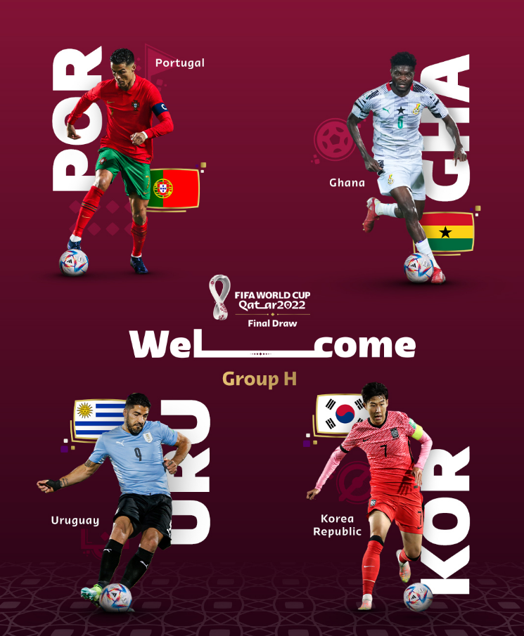 2022 FIFA 카타르 월드컵 조 추첨식에서 3번 포트를 받은 "대한민국"은 1포트 "포르투갈", 2포트 "우루과이", 4포트 "가나"와 함께 H조에 편성되었습니다.