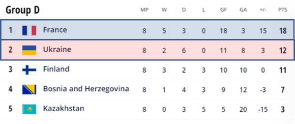 D조 순위: 프랑스, 우크라이나, 핀란드, 보스니아 헤르체고비나, 카자흐스탄